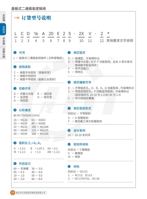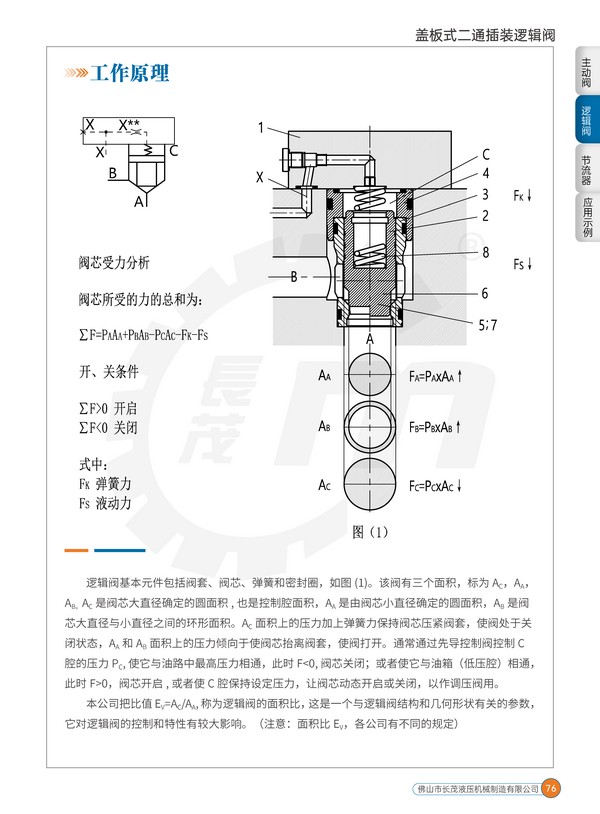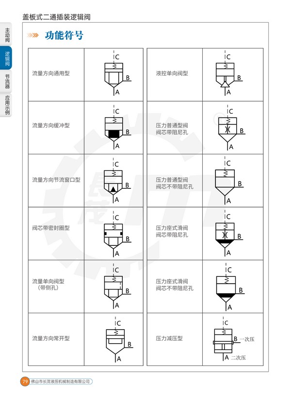 蓋板式二通插裝閥之名是為區(qū)別于螺紋插裝閥和螺紋插裝邏輯閥及插裝主動閥,但為簡化稱呼,符合習慣,在一般不太嚴格的場合,本公司把該閥主閥組件,也即插件泛稱為邏輯閥。該閥作為單獨元件,具二通開關邏輯功能,這也是邏輯閥名稱的由來。